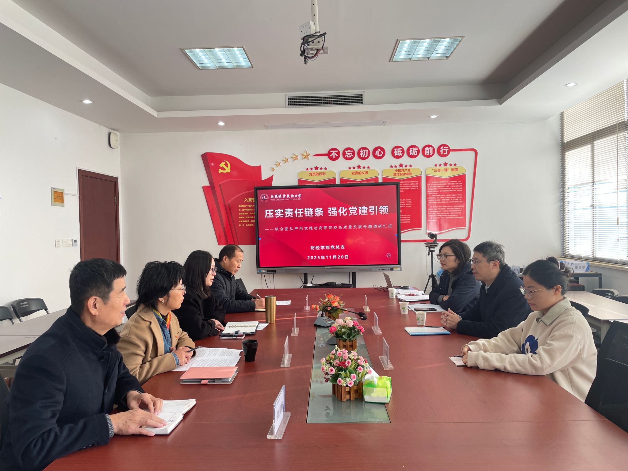 11 月 20 日,副校长奚茂龙带队赴财经学院开展全面从严治党工作专题调研。调研组通过实地走访、专题汇报、查阅资料、廉政谈话等方式,全面了解财经学院党建工作成效,推动责任落实落细。