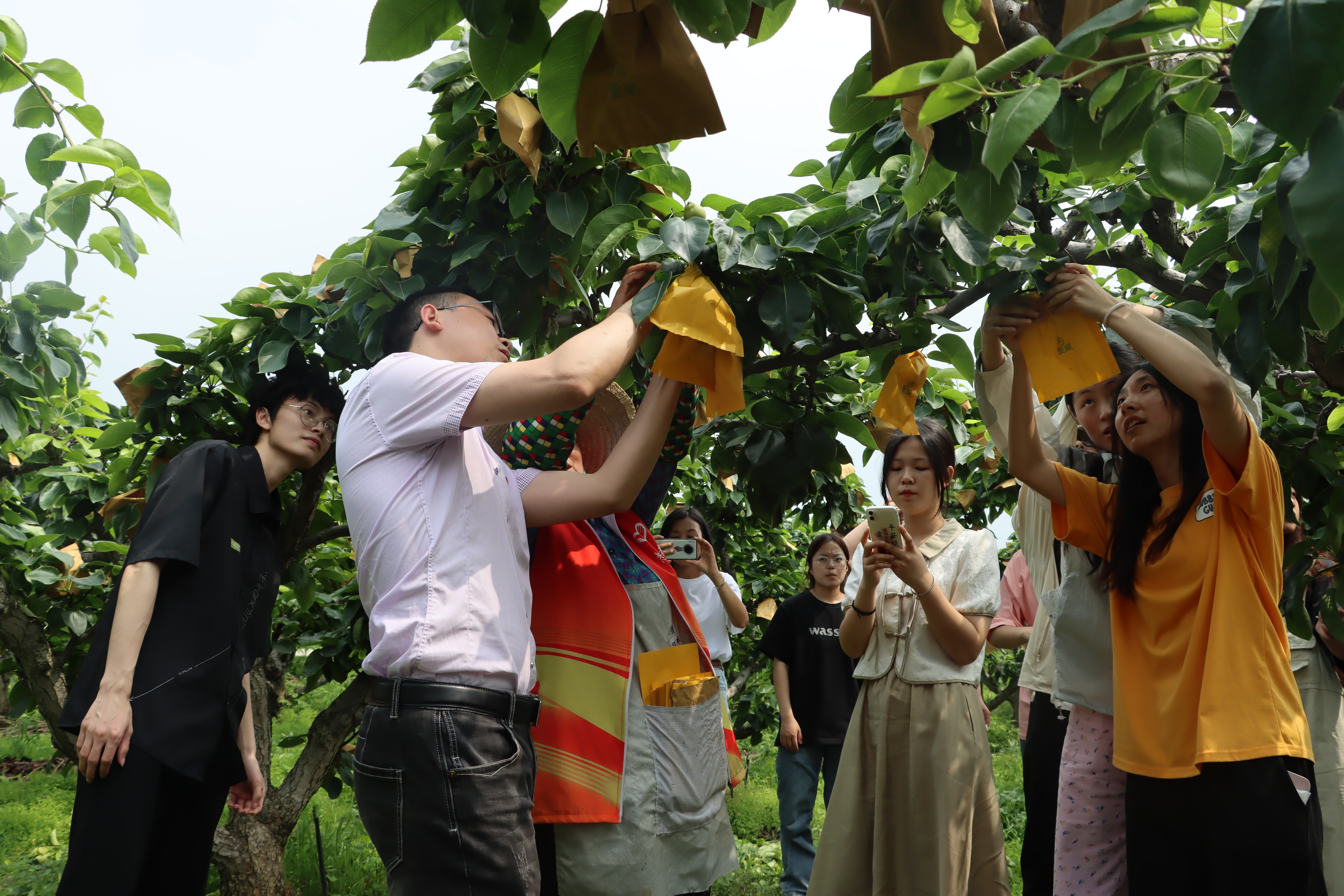 师生党员帮幼梨套袋