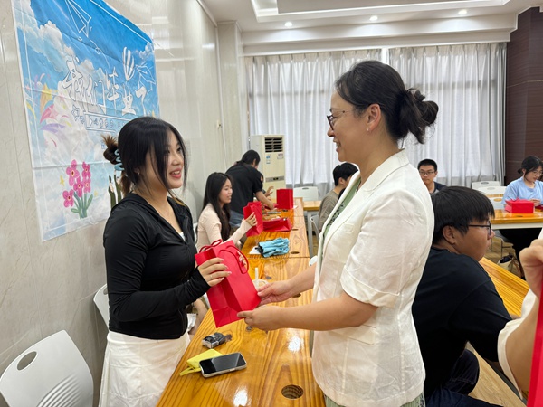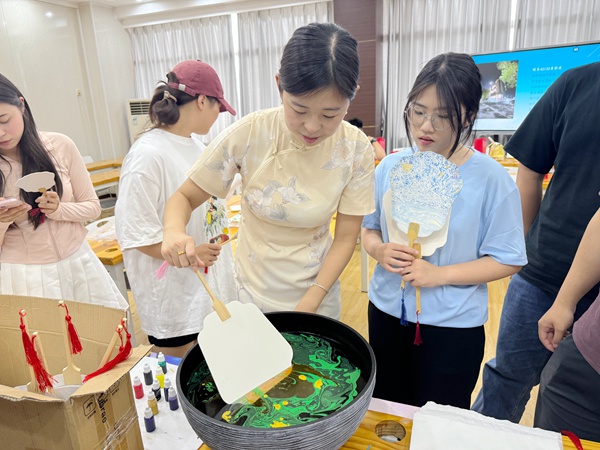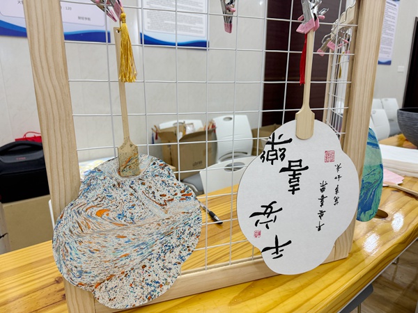 毕业如“漆”而至,生活至“扇”至美。座谈会后,学院还特此还开展了毕业生漆扇DIY活动,以扇寄思,以墨传意,毕业生们用一柄手工制作的漆扇“孤品”纪念自己独一无二的校园青春记忆。活动中,大家现场体验了“选色—滴墨—搅漆—浸扇—取扇—晾晒”漆扇制作全过程,将自己喜欢的漆液滴入清水,通过垂直、旋转、波浪形等多种方式将白扇缓缓放入水中,水流动的波纹与漆液轻盈晕开的脉络交相融合,为扇子覆上独特缤纷的色彩和图案。晾晒后,蘸上墨汁,笔尖在纸上轻轻滑过,留下“前程似锦““未来可期”等字迹,寄托对未来的憧憬和期待。