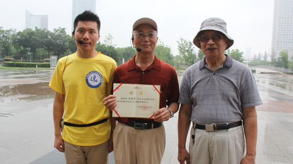 上午8:00,实践团在无锡博物院广场进行了授旗仪式,仪式由领队孙台维老师主持。他首先介绍了到场的嘉宾,关工委老同志朱献清老师与无锡市教育局老干部仇老师,然后向朱献清老师颁发了校外辅导员聘书。随后,朱献清老师发表了热情洋溢的讲话,希望同学们能通过此次活动宣传无锡这座百年工商城的革命历史,弘扬无锡“尚德务实、和谐奋进”的城市精神最后,徐逸同学带领全体队员进行了宣誓。