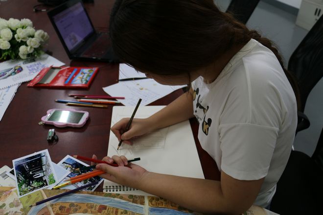 手绘作品的创作者是袁紫铭与金丽娜同学,她们有较好的绘画功底,热爱家乡无锡,热爱祖国。她们决心以“手绘红色无锡”的方式来展现“90后”的爱国热情。