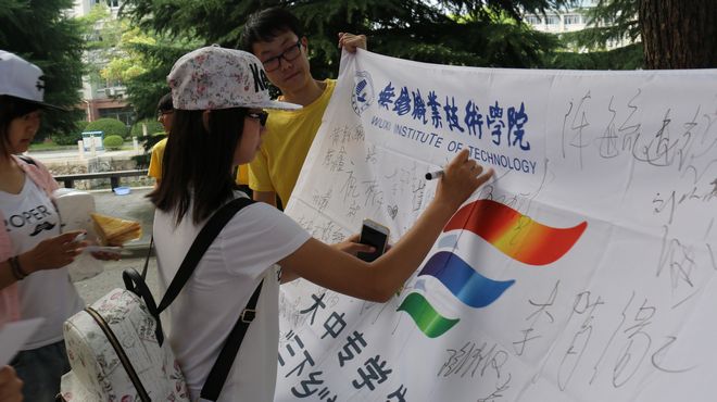 在活动结束后,志愿者们余兴未尽,在江南大学开展了签名送明信片活动。在听到志愿者们的介绍后,江大学子纷纷签名支持“重温红色历史 手绘红色无锡”四进四信实践团的活动。