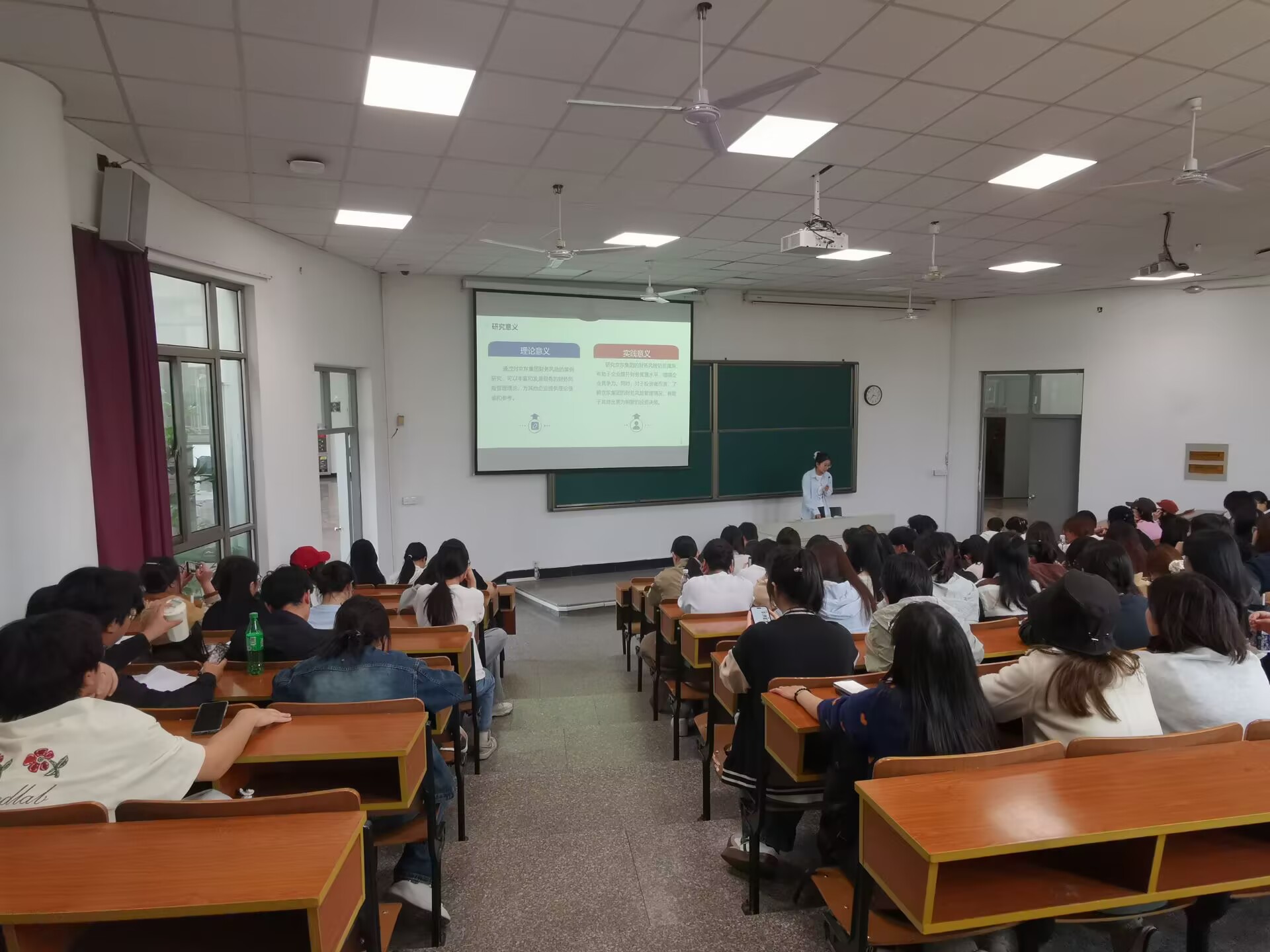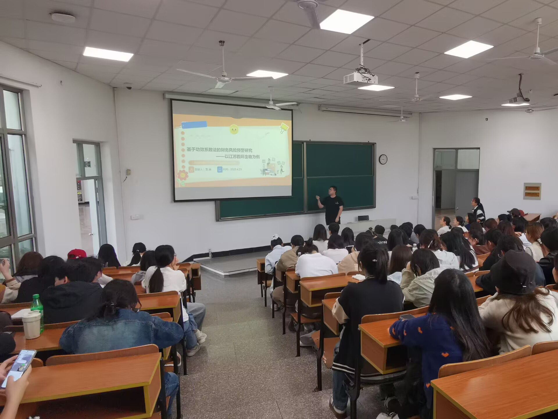此次公开答辩的学生是财务22322贺笑和财务22321章意同学,题目分别是《上市公司财务风险分析与防范措施的研究--以京东集团为例》《基于功效系数法的财务风险预警研究--以江苏四环生物为例》,指导老师分别是吴新尉和陈云老师。