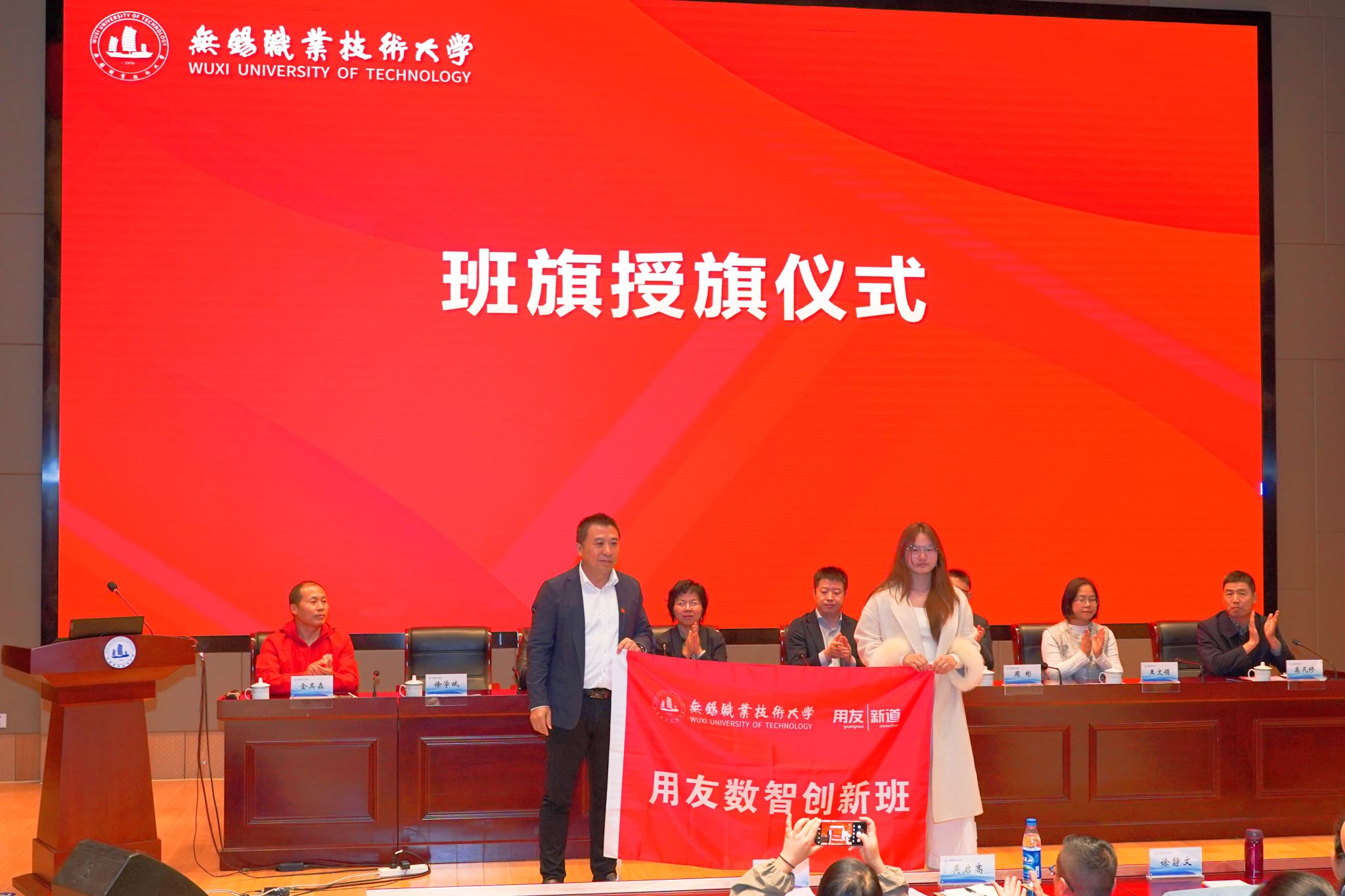 新道科技股份有限公司江南区兼江苏分公司总经理任子宜充分肯定了过往校企合作取得的丰硕成果,并表示新道与畅捷公司将持续投入资源,依托数智财经产业学院这一优质平台,为同学们的学业精进与技能提升提供更广阔的发展空间与实践机遇。他结合行业企业发展实际,向与会同学分享了一个优秀财经从业者应具备的素质,真诚期待未来有更多优秀学子加入新道与畅捷的大家庭,共同投身于数智财经事业。仪式上,新道科技江苏分公司生态伙伴总监徐学斌庄重地向2025级用友数智创新班学生代表授予班旗,勉励他们开启新的创新学习征程。