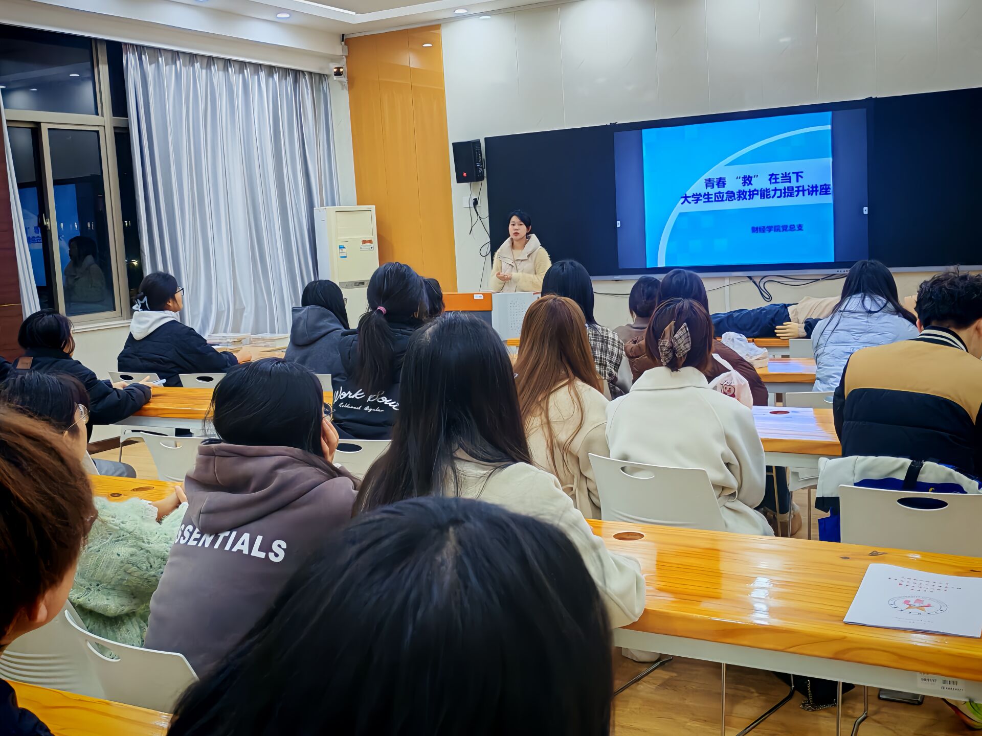 为全面提升大学生应急救护素养,增强青年群体在突发事件中的自救互救能力,财经学院于明德楼B-404举办“青春‘救’在当下:大学生应急救护能力提升讲座”,由应急救护师刘美玉老师主讲。讲座围绕“关键时刻,让救护成为本能”这一目标,通过理论讲授与情境实践相结合,为学生带来了一堂形式生动的应急救护公开课。
