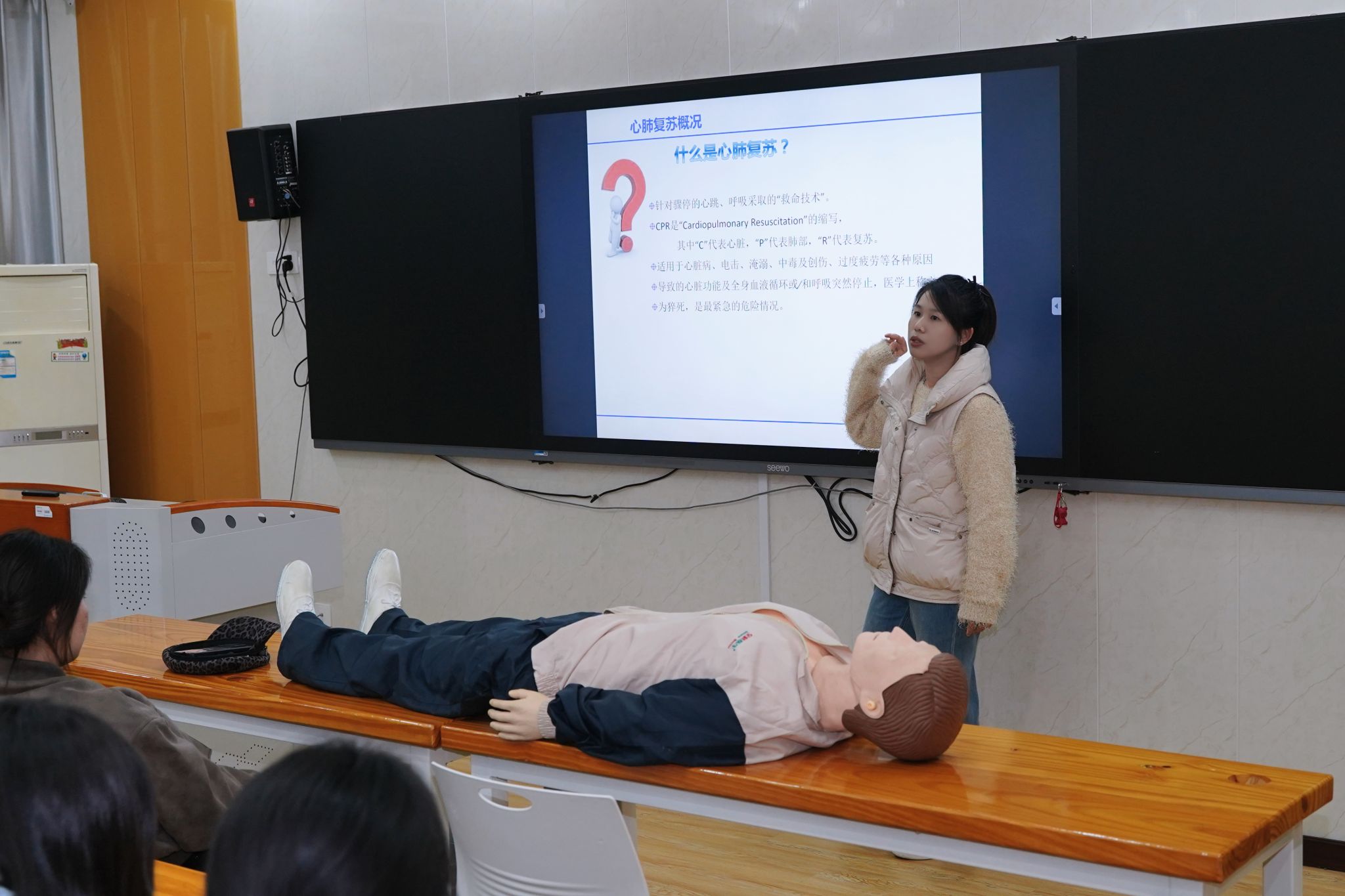 讲座伊始,刘美玉老师从现实案例切入,以社会上热点突发事件处置情况为引,引导学生明确掌握急救知识的必要性和紧迫性。她指出:“心跳骤停时,每延误1分钟,存活率就下降7%—10%。”鲜明的数据让学生深切感受到掌握急救技能的重要意义。在理论讲解环节,刘老师重点围绕心肺复苏(CPR)的核心步骤进行系统讲述,从环境评估、意识判断,到胸外按压的位置、频率与力度,再到人工呼吸的要领与AED的规范使用,步骤清晰、要点明了,并现场示范心肺复苏操作要领。为检验学生学习成果,她邀请多名学生依次进行模拟演练。在她的指导下,同学们从最初的拘谨生疏,到逐渐掌握动作节奏,按压深度、手位调整、气道开放等环节逐一纠错、不断优化,课堂氛围热烈而专注。