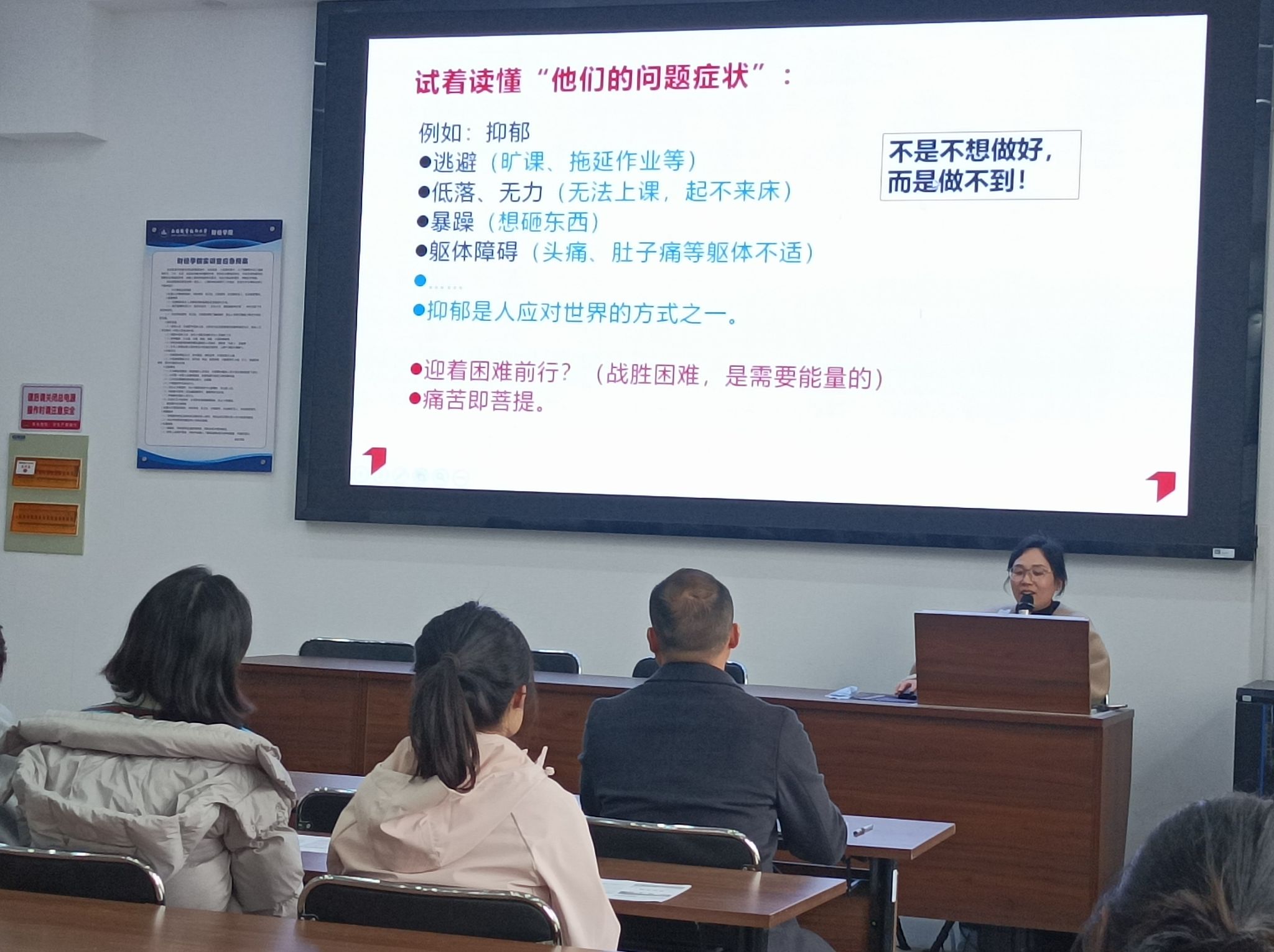 余新年老师结合春季气候多变、学业压力叠加等因素,系统剖析了大学生群体易发的抑郁、焦虑、适应障碍等心理问题的典型特征。她通过丰富的案例分析,深入浅出地讲解了如何从学生的日常言行、情绪状态、社交表现、学业波动等方面敏锐捕捉“预警信号”,并重点阐述了谈心谈话的时机选择、沟通技巧以及危机事件上报与处置的规范流程。